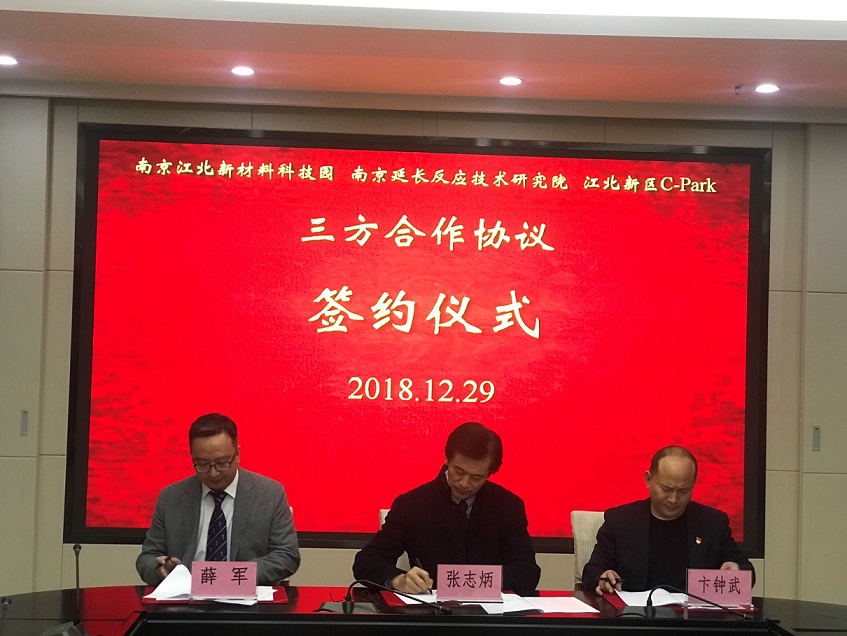 2018年12月29日下午两点整,南京江北新材料科技园、南京延长反应技术研究院、我司下属子公司华创公司(南京江北新区C-Park)三方合作签约仪式在新材料科技园举行。江北新区管委会副主任陈潺嵋出席并主持签约仪式。我公司董事长薛军、南京江北新材料科技园主任卞钟武、延长研究院院长张志炳在合同上签字并交换文本。新材料科技园副主任刘小国、华创公司副总操学锋等见证了签约。仪式的完成标志着南京延长反应技术研究院正式落户南京江北新区C-Park。
